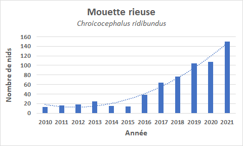 - La colonie de Mouettes rieuses, avec 76 couples, s’est encore développée. Elle a produit environ 150 poussins.